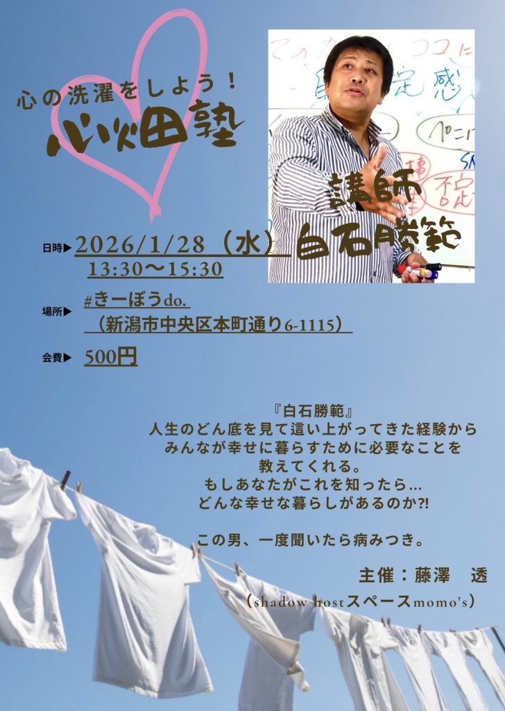 きーぼうdo.Libraly 1.28(Wed)心の洗濯をしよう!心畑塾 2026.01.06 Post Share Line 2026.1.17(Sat)酒とご馳走Vol.14 前の記事 販売ができる販売棚を設けたい! 次の記事